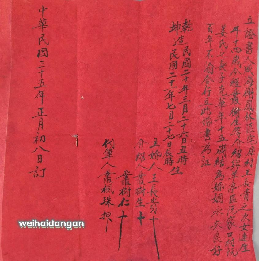 凤林区宅库村王长青次女连生(14岁)与羊亭区阮家口村阮姜氏长子克华(15岁)订立的婚书(1946年)