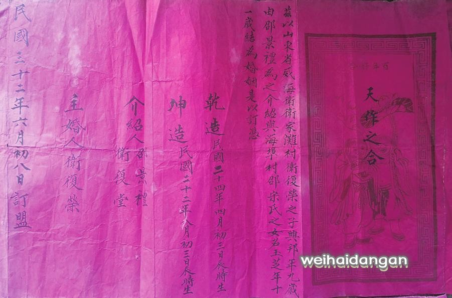 卫家滩村卫复荣之子兴邦(9岁)与海埠村邵宋氏之女玉芝(11岁)订立的婚书(1943年)